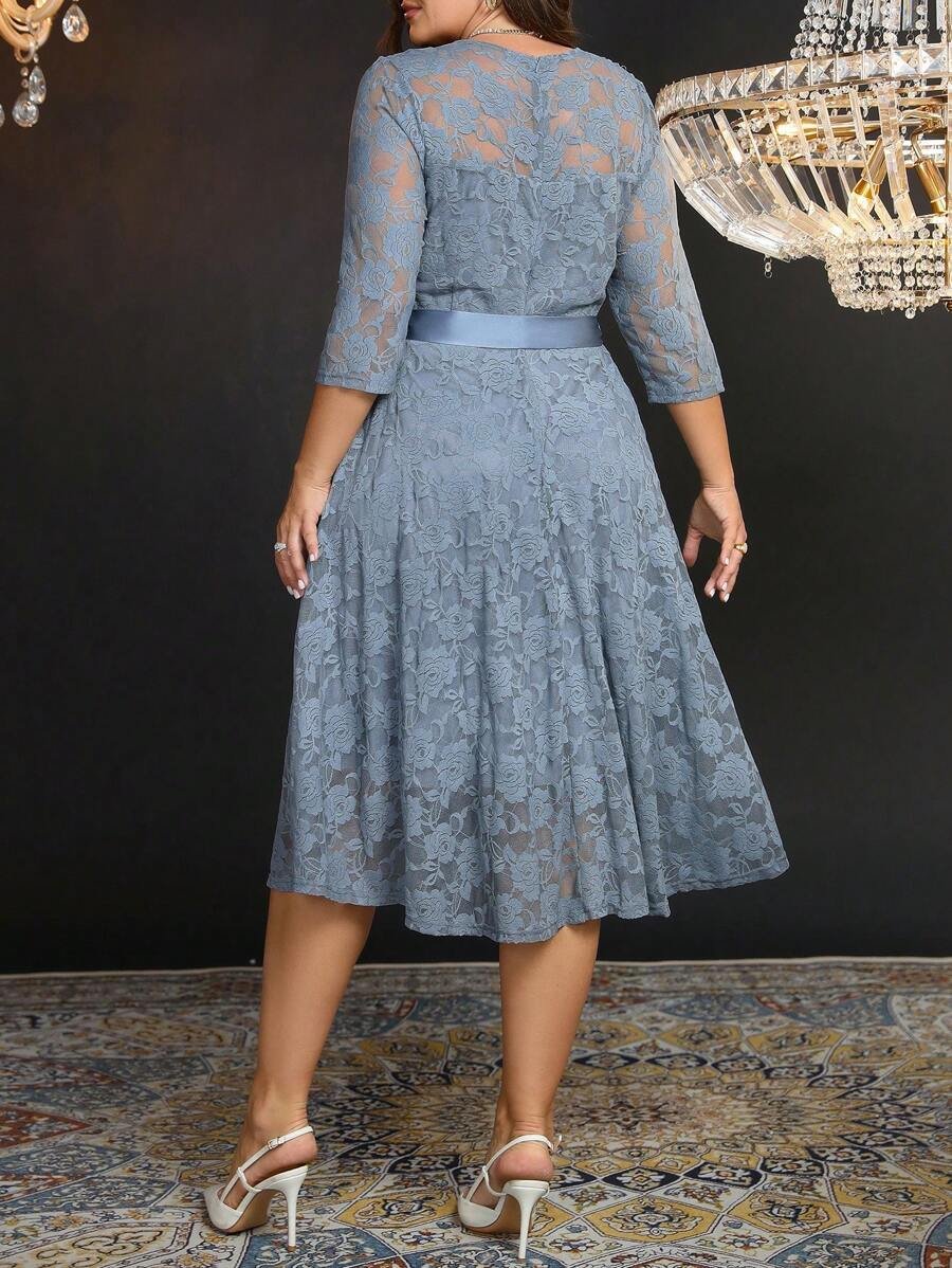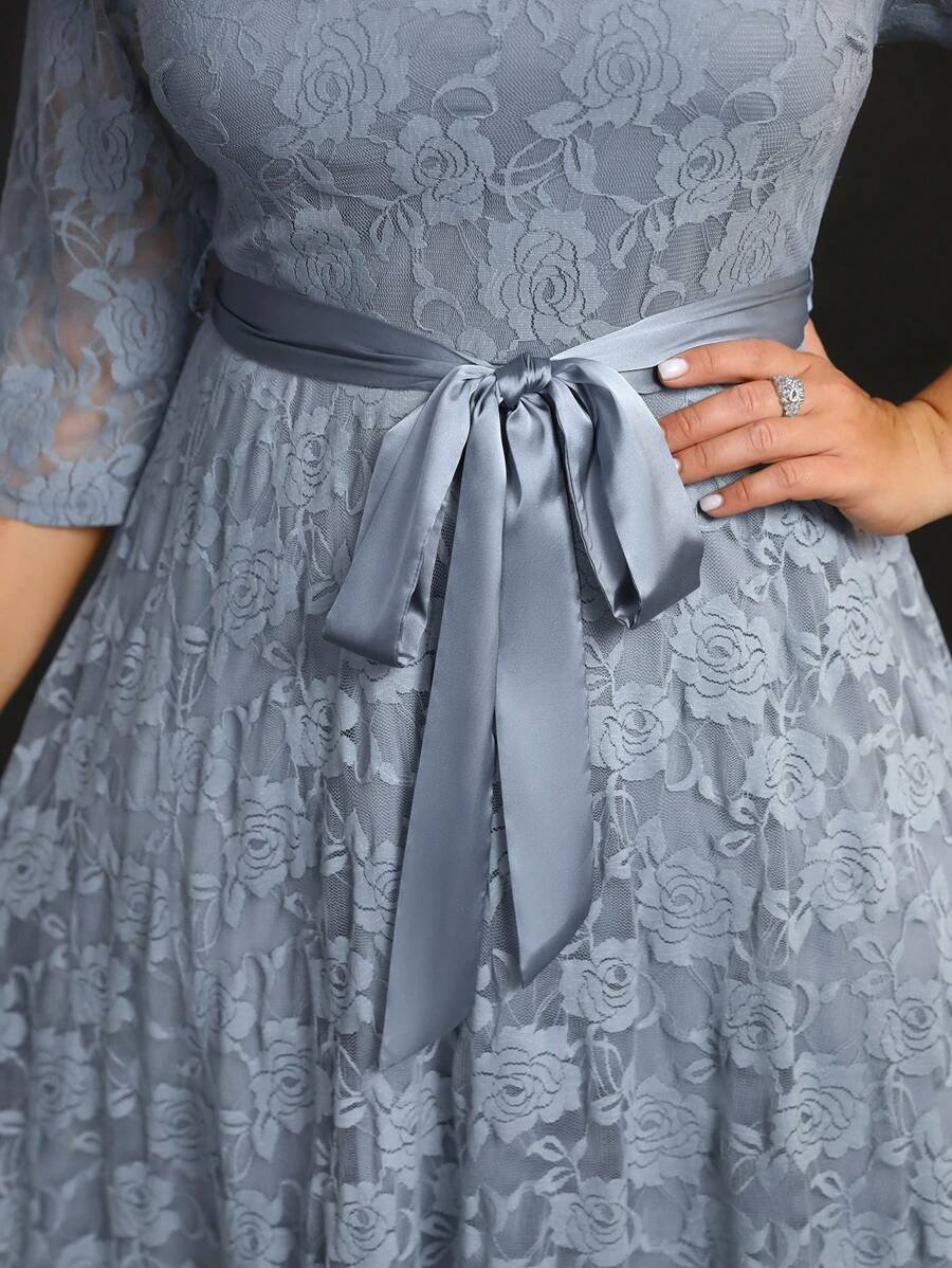 Robe élégante grande taille avec encolure en dentelle, ruban à la taille et manches trois-quarts, idéale pour une allure féminine et raffinée