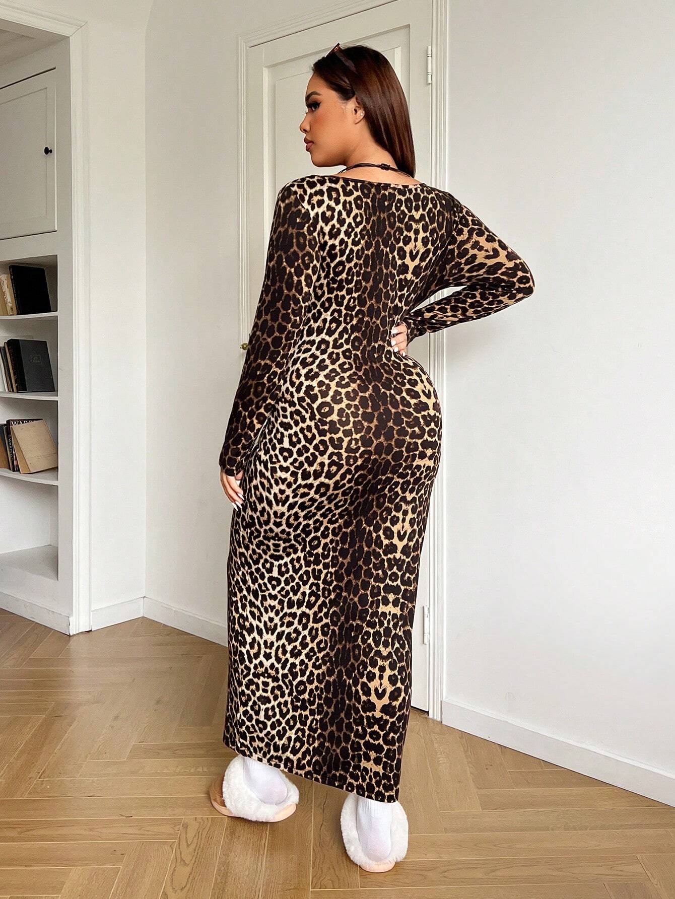 Robe SHEIN grande taille pour femmes, imprimé léopard élégant, col rond et manches longues. Idéale pour les soirées et les rendez-vous, elle offre un style sophistiqué et met en valeur les courbes avec confort et élégance.
