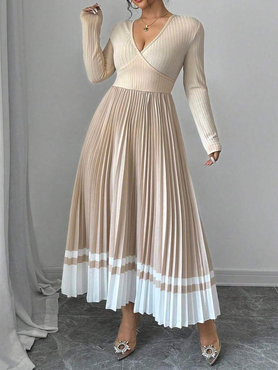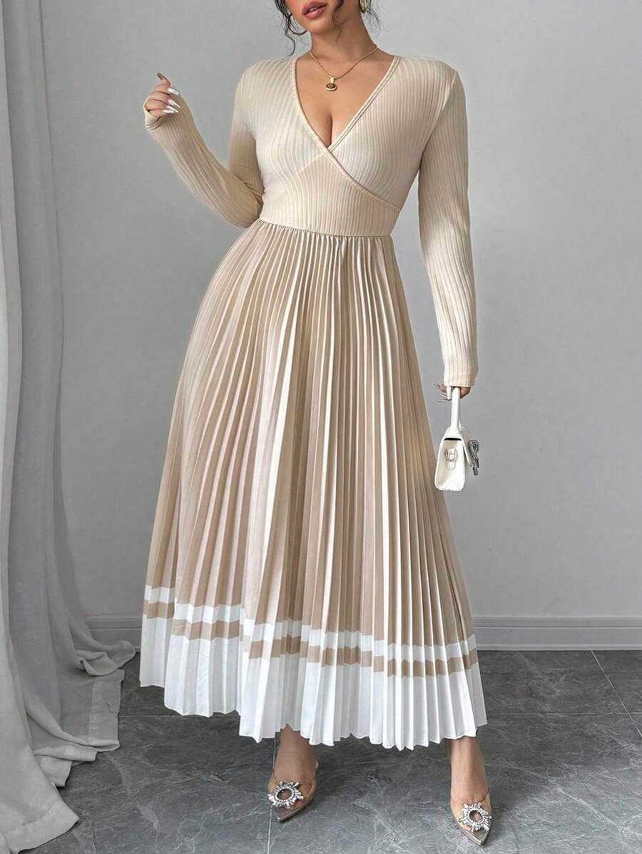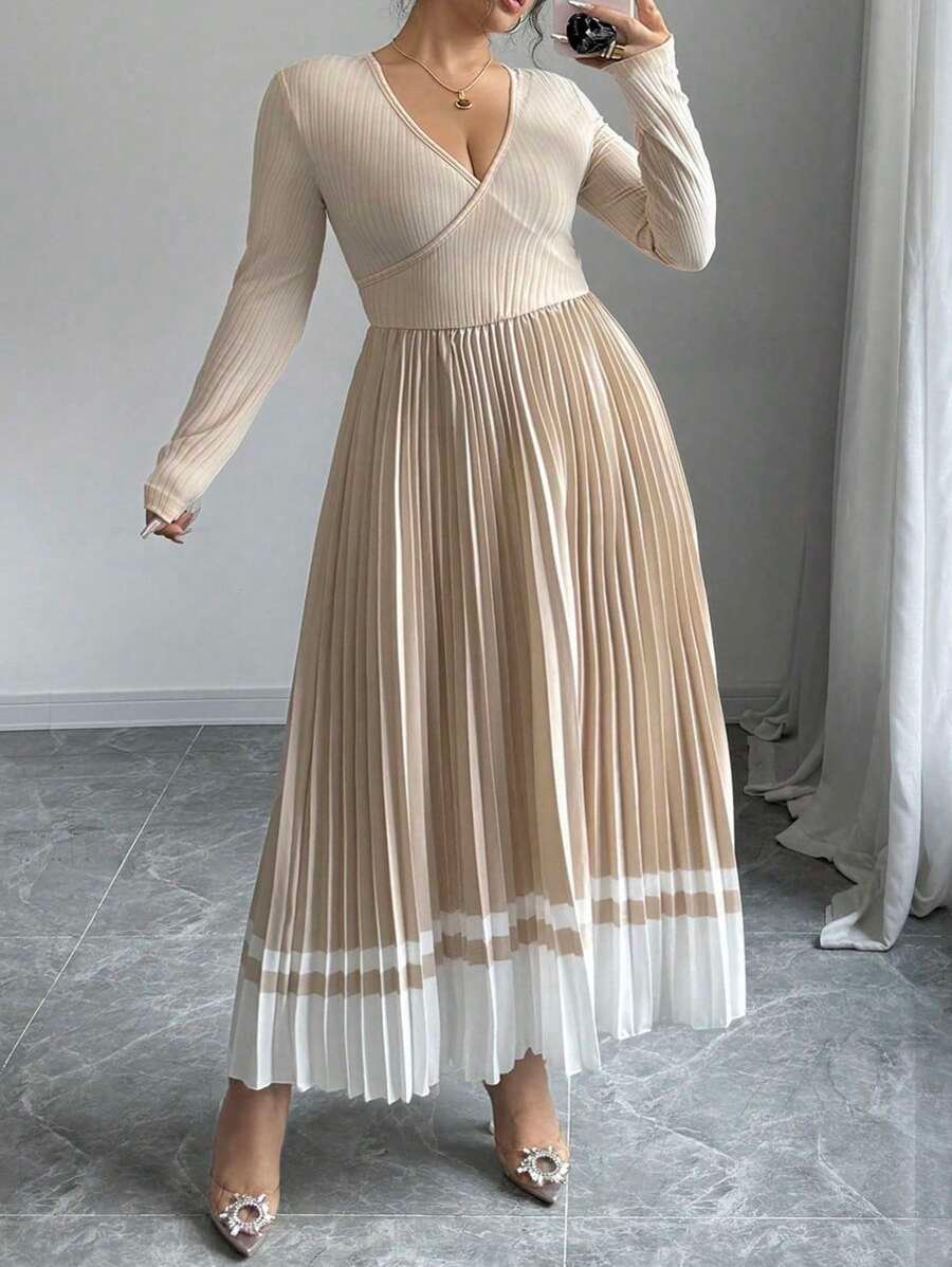 Robe maxi grande taille à col V, taille nouée et effet dégradé plissé, alliant élégance vintage et confort pour le quotidien.