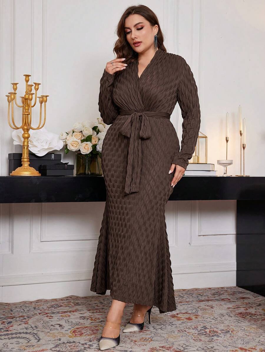 Robe maxi grande taille unie à manches longues et coupe ajustée, élégante et polyvalente pour les soirées et occasions spéciale
