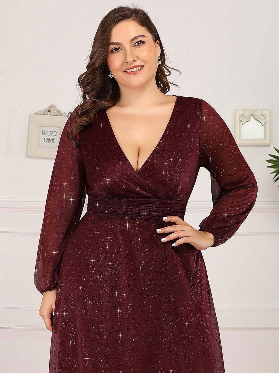 Robe élégante grande taille avec col V profond, manches bouffantes et fente, parfaite pour une tenue chic et féminine lors des grandes occasions.